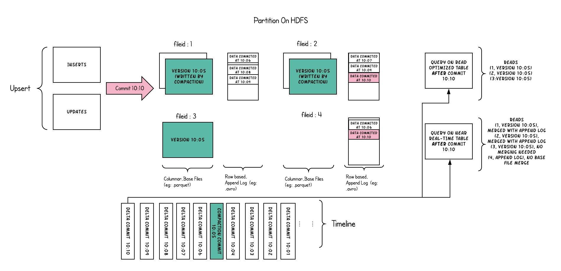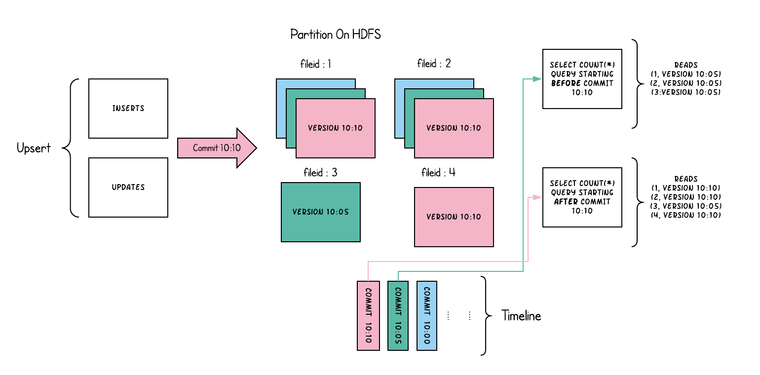 如您所见,旧查询不会看到以粉红色标记的当前进行中的提交的文件,但是在该提交后的新查询会获取新数据。因此,查询不受任何写入失败/部分写入的影响,仅运行在已提交数据上。
