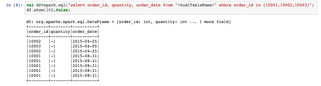 val df=spark.sql("select order_id, quantity, order_date from "+hudiTableName+" where order_id in (10001,10002,10003)")