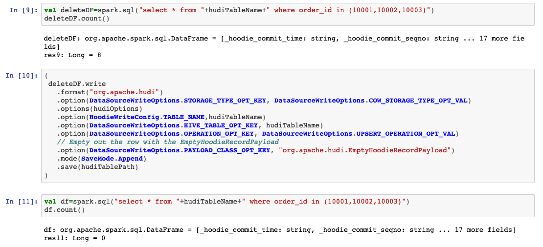 val deleteDF=spark.sql("select * from "+hudiTableName+" where order_id in (10001,10002,10003)")